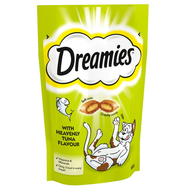 DREAMIES™ cat treats are packed full of things cats love. Share moments with your feline friend with these dual-texture treats with an enticingly crunchy outside and a soft inside. DREAMIES™ with Heavenly Tuna flavour contains vitamins and minerals, at just 2 calories per treat. So go on, give the bag a shake and watch your cat come running!