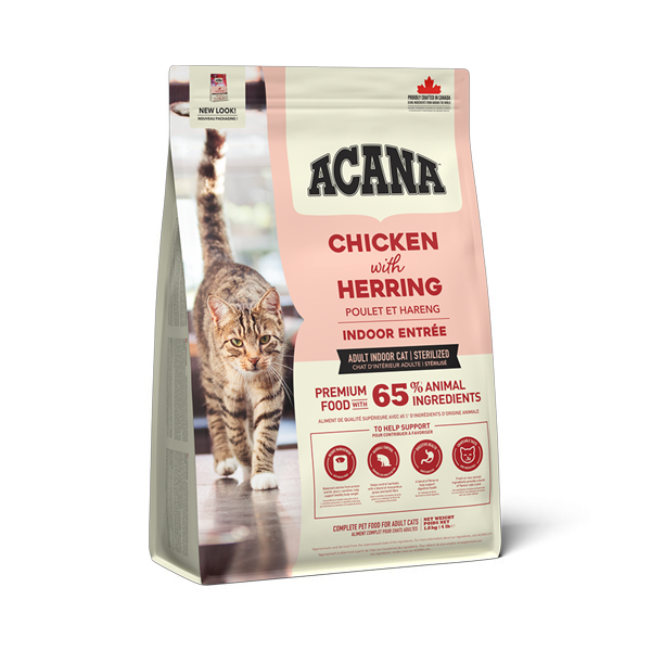 Specially crafted for your indoor cat, our ACANA™ Indoor Entrée Recipe is uniquely suited to the needs of your domesticated feline. Rich with 65%1 quality animal ingredients1 including fresh chicken and raw turkey, and raw whole herring, Indoor Entrée has the animal protein your cat needs to be their best. This nutrient-dense recipe also helps support key health benefits for your indoor cat, including weight management, hairball control, and digestive health. Nurture your indoor feline with a recipe tailored to keep them healthy and happy with ACANA Indoor Entrée!