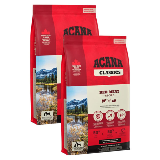 ACANA recipes are thoughtfully crafted from start to finish with delicious, quality ingredients. With a balanced 50/50 split between rich meat ingredients and nutritious fruit, grains and vegetables, ACANA Classics Red Meat recipe provides your dog with a filling and nutritious meal crafted from simple, wholesome ingredients. It also includes nutrient-rich ingredients that support three key health benefits, including immune function, healthy digestion, and healthy skin and coat.