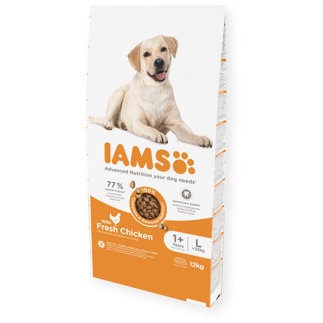 Nourishing your adult dogs natural needs by feeding them advanced nutrition with 77% animal protein* that they will truly enjoy. Our IAMS Advanced Nutrition dog dry food with fresh chicken large breed 1+ Years incorporates a DentalCare System to maintain teeth health and reduce tartar buildup. Moreover, an antioxidant blend enriched with vitamin E supports the immune system of adult dogs, bolstering overall health and defenses. The included Omega-3 and Omega-6 fatty acids contribute to healthy skin and coat, alongside providing a lustrous sheen to their fur. The recipe is formulated with key nutrients to help nourish the heart for a strong heart muscle. Choose IAMS to provide your faithful companion with not just necessary nutrition, but the nourishment they genuinely deserve.