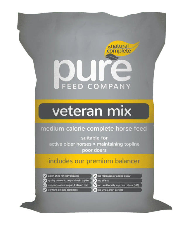 If your veteran horse also struggles to chew chaff, but doesn't need a pelleted feed just yet - don't worry! Pure Veteran Mix uses a soft chop, making it easier for older horses to chew. With a built-in balancer tailored for senior horses, this feed contains everything your horse needs, making it simple to buy, easy to feed, and excellent value.
