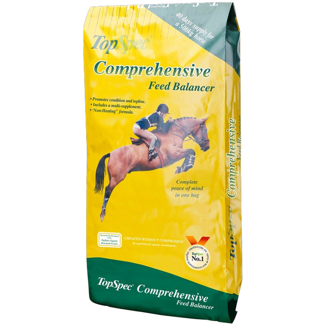 TopSpec Comprehensive Feed Balancer is a very palatable, high protein, cereal-grain-free, low sugar and starch, ‘Non-Heating’ concentrated feed that contains a multi-supplement including the levels of micronutrients and digestive aids normally only found in high quality specialised supplements, including e.g. a superb hoof supplement and generous levels of antioxidants.