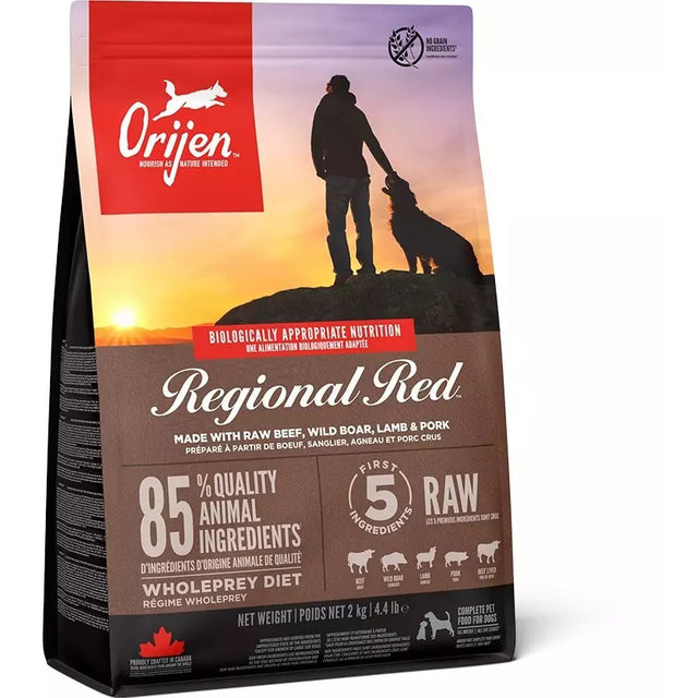 Help your dog thrive with the power of protein-rich recipes that provide peak nourishment. Dogs are ancestral carnivores, so they need a Biologically Appropriate diet rich and varied in whole animal ingredients. ORIJEN™ Regional Red diet is made with meat from raw1 beef, lamb, pork, beef liver and salmon. Packed with WholePrey animal ingredients like meat, fish, organs and bone, ORIJEN Regional Red diet is made with the most nutrient-dense, succulent parts of the prey to deliver the nutrition dogs need. With 85%2 quality animal ingredients and a freeze-dried liver coating, this diet is beyond comparison.