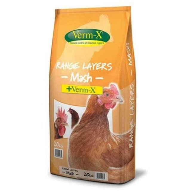 20kg Bag of Range Layers Mash with Verm-X from Copdock Mill. Premium quality Poultry Layers Mash with added Verm-X for protection against intestinal challenges in your chickens.