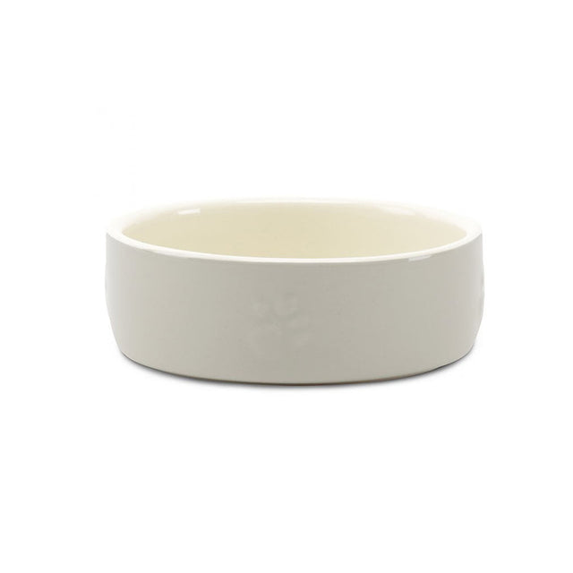 Made from heavy stoneware ceramic it's designed to help prevent cats and small pets from moving the bowl around when eating. It also features an ergonomic finger hold for easier serving and lifting. This durable pet food bowl is chip and bite resistant as well as dishwasher and microwave safe.
