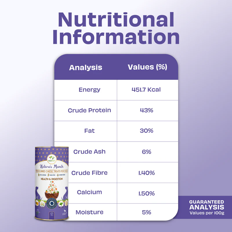 Specially formulated to support digestive wellness, these freeze-dried treats combine the goodness of cottage cheese with papaya, chamomile, parsley, and psyllium. Each ingredient is carefully selected for its role in promoting smoother digestion, reducing bloating, and maintaining a healthy gut. Naturally low in carbs and rich in fiber, these treats are perfect for dogs with sensitive stomachs or those on weight management plans. Light, crunchy, and packed with nutrients, they’re a functional snack your dog will love.